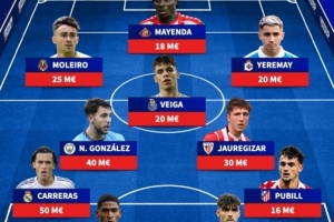 后衛:卡雷拉斯(皇馬,5000萬歐)、莫斯克拉(阿森納,3500萬歐)、阿森西奧(皇馬,3000萬歐)、普比爾(馬競,1600萬歐)