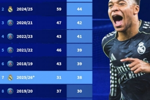體育資訊2月14日訊 姆巴佩本賽季各項賽事31場比賽已經打進38球,距離個人單賽季俱樂部進球紀錄還差6球,以下為具體情況: