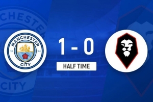 上半場(chǎng)傷停補(bǔ)時(shí)2分鐘,半場(chǎng)結(jié)束,曼城暫1-0索爾福德城。