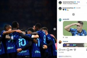 踢滿全場的國米隊長勞塔羅賽后更新社媒,曬出全隊相擁慶祝的合影,并配上了“??????”的emoji。