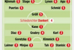 體育資訊2月15日訊 德甲第22輪比賽,拜仁客場3-0擊敗不萊梅,《圖片報》對兩隊球員進行了評分。