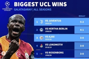 體育資訊2月18日訊 歐冠1/8決賽附加賽首回合,加拉塔薩雷5-2大勝尤文,根據德轉統(tǒng)計,本場比賽是加拉塔薩雷的歐冠聯賽最大比分勝利。
