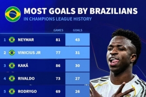 體育資訊2月18日訊 德國轉會市場統計了巴西球員在歐冠的進球數量,并列出歐冠歷史巴西球員射手榜,內馬爾43球居首,維尼修斯31球次席。