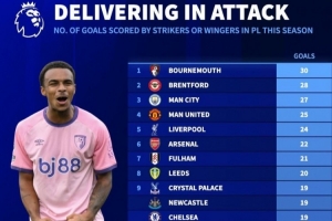 體育資訊2月18日訊 《轉(zhuǎn)會(huì)市場》統(tǒng)計(jì)了本賽季英超各隊(duì)中鋒+邊鋒進(jìn)球情況,伯恩茅斯力壓布倫特福德居首。