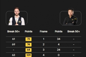 全場比賽特魯姆普打出4桿50+和1桿破百,周躍龍最高分僅34分,遭到零封止步16強。