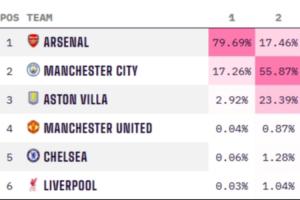 機(jī)構(gòu)仍然較為看好阿森納奪冠,相比之下,曼城目前的奪冠概率為17.26%。