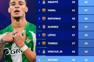 在曼聯經歷低谷之后,安東尼在貝蒂斯重振了自己的職業生涯。本賽季到目前為止,他各項賽事代表貝蒂斯出戰29場比賽,打進10球送出9次助攻。
