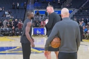 賽前熱身環節,勇士新援波爾津吉斯來到場地中央,和前隊友杰倫·布朗寒暄幾句。