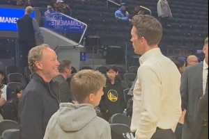 賽前,目前賦閑在家的冠軍教練布登霍爾澤出現在場邊,和勇士總經理鄧利維交流。
