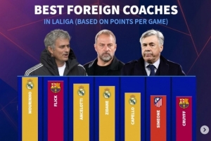 體育資訊2月21日訊 《轉會市場》統計了西甲歷史至少執教50場的外籍主帥場均拿分情況,穆帥依然領跑。