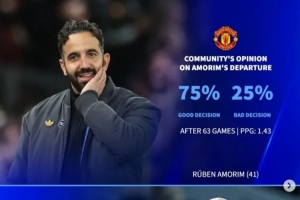 阿莫林(曼聯(lián)):63場(chǎng),場(chǎng)均1.43分。75%支持,25%反對(duì)。
