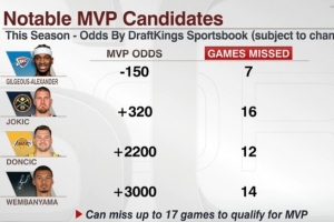 本賽季目前MVP賠率前4(最多缺席17場(chǎng)):