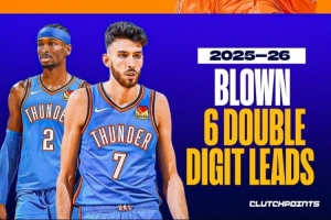 體育資訊2月21日訊 據(jù)美媒ClutchPoints統(tǒng)計(jì),上賽季,雷霆在奪冠的歷程中(常規(guī)賽+季后賽)一共僅5次在手握兩位數(shù)領(lǐng)先的情況下被逆轉(zhuǎn)。