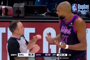 GIF-戈貝爾和巴格利籃下糾纏,裁判先吹戈貝爾技犯,隨后雙方技犯,回放后升級為戈貝爾一級惡意犯規