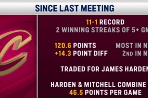 騎士近12場11勝1負,場均得到120.6分,凈勝14.3分;哈登&米切爾搭檔后,兩人場均砍下46.5分。