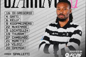 尤文首發:16-迪格雷戈里奧、4-加蒂、6-凱利、27-坎比亞索、5-洛卡特利、8-庫普梅納斯、19-凱夫倫·圖拉姆、22-麥肯尼、21-米雷蒂、10-伊爾迪茲、20-奧蓬達