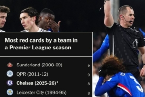 體育資訊2月22日訊 切爾西本輪1-1戰平伯恩利,福法納染紅,根據The Athletic統計,切爾西本賽季英超已經吃到8張紅牌,在英超球隊單賽季紅牌榜上排在第三位。