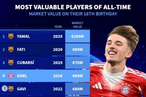 德轉(zhuǎn)列歷史18歲生日時球員身價榜:歐元