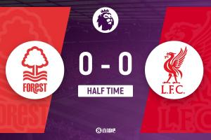 上半場傷停補時3分鐘,半場結束,利物浦暫0-0諾丁漢森林。