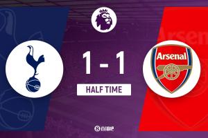 上半場傷停補時8分鐘,半場結束,阿森納暫1-1熱刺。