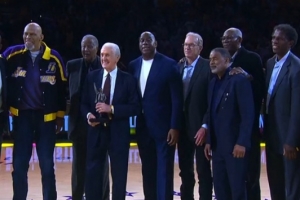 現場,湖人眾名宿出席儀式;萊利打趣道:“在所有來的這些人中,只有一個人向我展示了真正的尊重,那就是詹姆斯·沃西(上圖左1),他穿了西服打了領帶。其他的人都太隨意了,每人罰你們2000美元。”