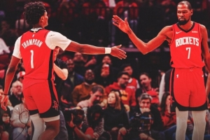 賽后,火箭官方曬出本場贏球海報,封面為杜蘭特與阿門·湯普森的擊掌瞬間。