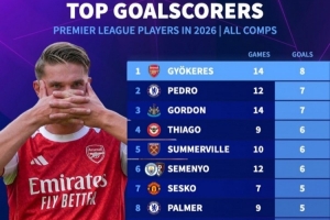 體育資訊2月24日訊 德轉統計了英超球員2026年各項賽事進球排名,阿森納前鋒約克雷斯8球領跑。