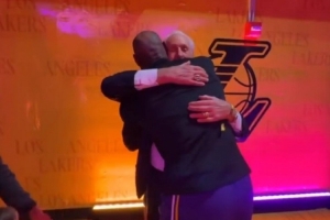 詹姆斯比賽開始前,在球員通道對曾經的主教練萊利表達了祝賀,熱火官方社媒也發布了兩人擁抱的瞬間。
