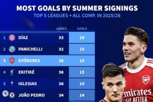 本賽季五大聯賽新援各項賽事總進球榜: