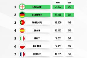 目前個聯賽歐戰積分方面,英超早已鎖定前二,新賽季將有一個額外的歐冠名額,目前德甲積分暫時排名第二。