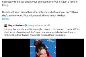Megan Basham轉(zhuǎn)發(fā)了這段視頻,并在社媒寫(xiě)道:抱歉,即便拋開(kāi)背叛這一點(diǎn)不談,這個(gè)女人也糟糕透了。她的傲慢程度簡(jiǎn)直爆表。不管她拿過(guò)多少獎(jiǎng)牌,我都找不到任何一點(diǎn)值得我女兒學(xué)習(xí)的地方。