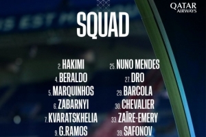 后衛:2-阿什拉夫、4-貝拉爾多、5-馬爾基尼奧斯、6-扎巴爾尼、21-盧卡斯·埃爾南德斯、25-努諾·門德斯、51-威廉·帕喬