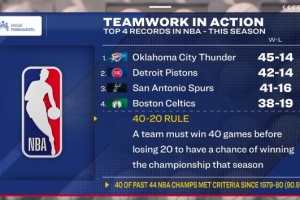 40-20奪冠定律:一支球隊必須在輸?shù)?0場比賽前贏得40場勝利,才有可能贏得當賽季總冠軍。