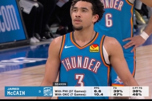 雷霆客場挑戰活塞,轉播方曬出麥凱恩本賽季交易前后的數據對比,得分,投籃命中率和三分命中率均明顯提升。