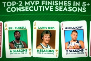 約基奇:20-21賽季至24-25賽季(連續5個賽季)