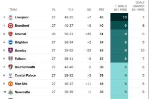 體育資訊02月26日訊 TA統計了本賽季英超球隊85分鐘及以后的進球及丟球排行榜,其中利物浦以10球位列榜首,阿森納8球位列第三。