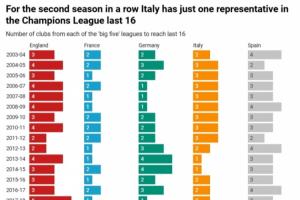 體育資訊02月26日訊 TA統(tǒng)計了自03/04賽季以來五大聯(lián)賽晉級歐冠16強的球隊數(shù)量。其中,近2個賽季均僅1支意甲球隊晉級16強。