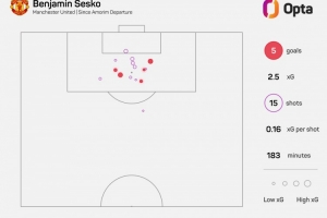 據Opta統計,阿莫林離任之后,舍什科為曼聯出戰6場英超比賽,打進5球,平均每37分鐘打進1球。