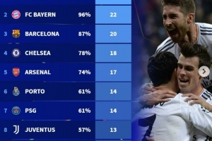 體育資訊2月27日訊 本賽季歐冠淘汰賽抽簽在即,德轉也盤點了歐冠自03/04賽季改革賽制之后,各支球隊晉級16強次數榜,具體如下(晉級成功率+次數):