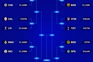 體育資訊2月27日訊 歐冠十六強戰抽簽已經出爐,《轉會市場》也列出了各隊身價情況,上半區明顯高出一籌。
