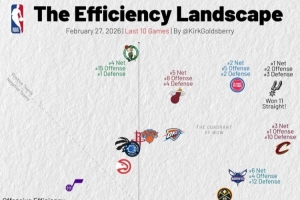 橫軸代表進(jìn)攻效率,越靠右越好,縱軸代表防守效率,越靠上越強(qiáng)。第一象限的球隊(duì)多為發(fā)揮出色的球隊(duì),而在第三象限的球隊(duì)通常為戰(zhàn)績(jī)比較糟糕的球隊(duì)。