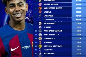 以下為2025年俱樂部球衣銷售收入top20: