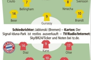 多特蒙德:科貝爾;施洛特貝克、安東、埃姆雷·詹;丹尼爾·斯文松、菲利克斯·恩梅查、喬布·貝林厄姆、揚·庫托;布蘭特、吉拉西、拜爾