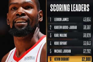 體育資訊2月28日訊 昨日,杜蘭特在戰勝魔術的比賽中拿到生涯第32000分,目前排名歷史得分榜第六。