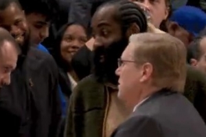 GIF-活塞主場(chǎng)音響設(shè)備出問題 哈登場(chǎng)邊熱聊