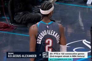 這是亞歷山大連續122場砍下20+,距離NBA歷史紀錄的張伯倫126場僅差4場。