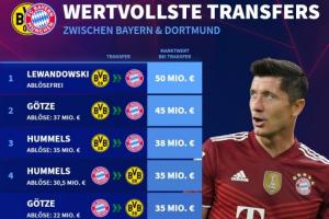 體育資訊02月28日訊 今晚,拜仁與多特將迎來德國國家德比。德轉統(tǒng)計了拜仁和多特兩隊之間的轉會,列出了轉會時球員身價榜。其中,萊萬從多特免簽加盟拜仁時身價5000萬歐居榜首,格策和胡梅爾斯分列二三。