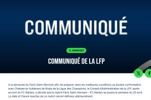 應巴黎圣日耳曼的要求,為了更好地備戰與切爾西的歐冠聯賽1/8決賽兩回合比賽,經與南特俱樂部協商,法國職業足球聯盟理事會決定將巴黎圣日耳曼與南特的比賽推遲至4月20日當周進行。確切比賽日期和開球時間將稍后公布。