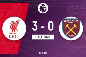 上半場傷停補時4分鐘,半場結束,利物浦暫3-0西漢姆聯。
