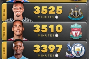4、格伊(水晶宮/曼城):3397分鐘